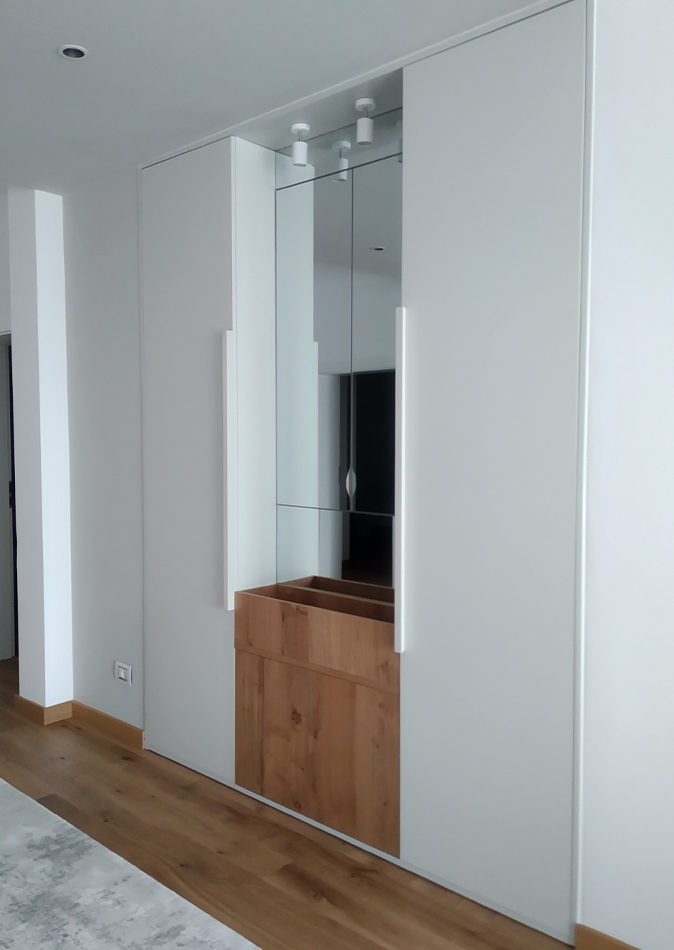 - We make the elements in the hallway from veneered MDF, high-quality chipboard from the Egger brand or painted MDF by your choice.